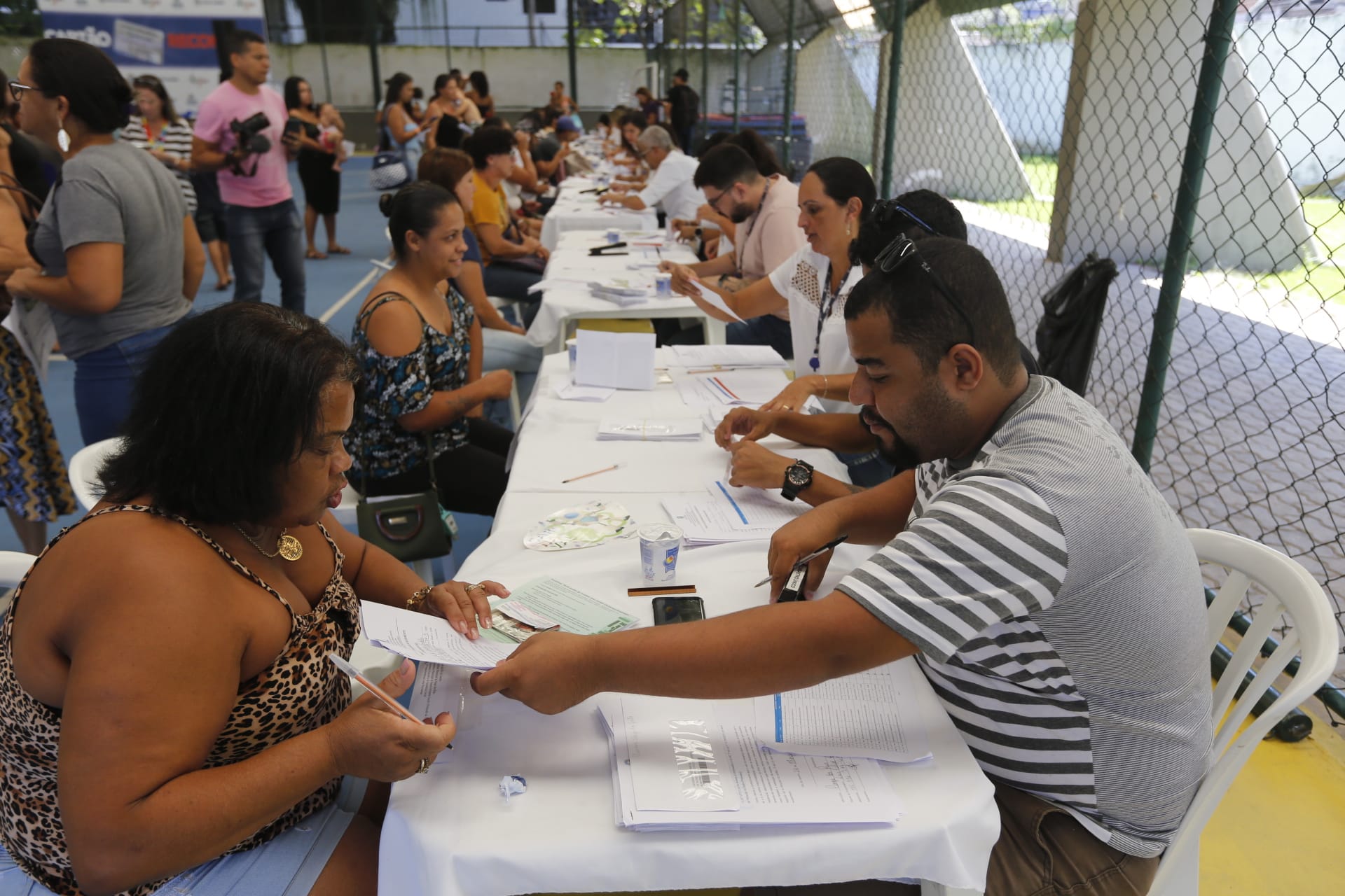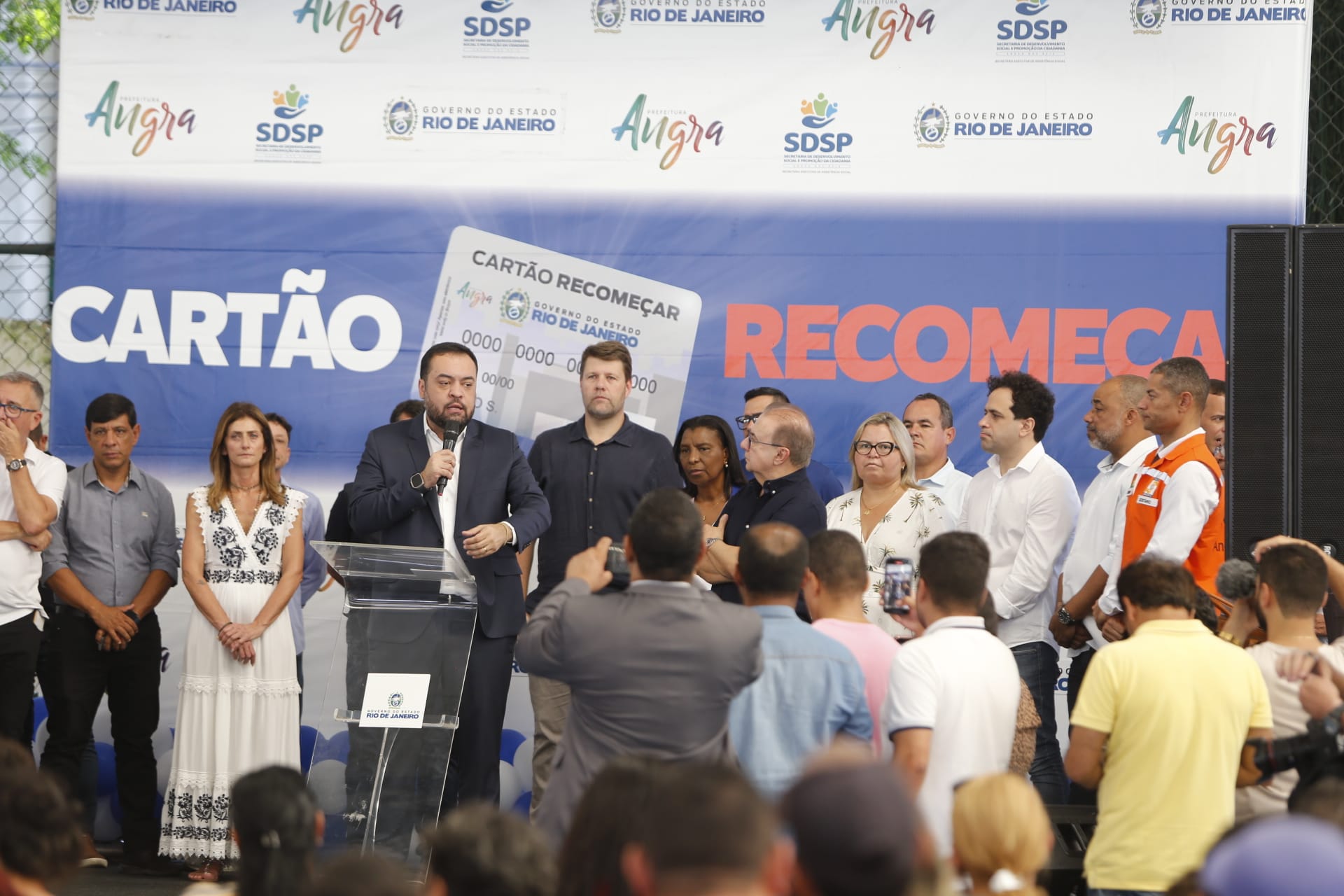O governador Cláudio Castro entregou, nesta sexta-feira, o Cartão Recomeçar a 500 famílias vítimas de temporais em Angra dos Reis, na Costa Verde Fluminense. Cada beneficiário receberá a quantia de R$ 3 mil. O objetivo é ajudar os moradores a adquirir material de construção, móveis e eletrodomésticos para retomarem suas vidas. A entrega simbólica foi realizada no Estádio Municipal Jair Carneiro Toscano de Brito.
