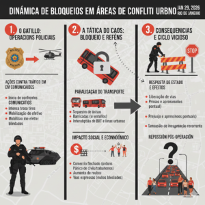 Para entender como esses episódios paralisam a cidade, veja abaixo como se organiza a dinâmica de bloqueios em áreas de conflito: